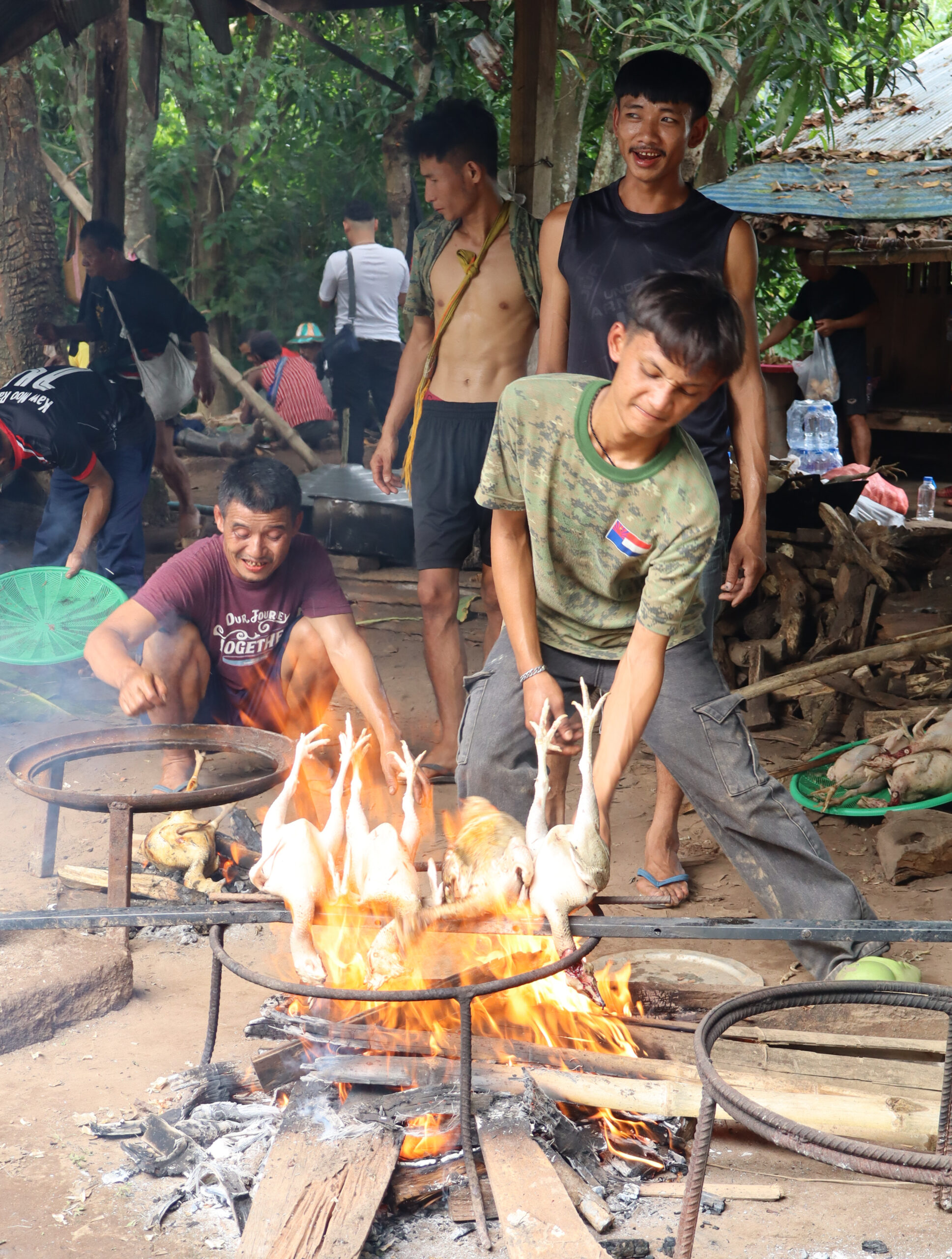 - 写真①式典参加者に振る舞うため、炭火でニワトリを焼く若者たち