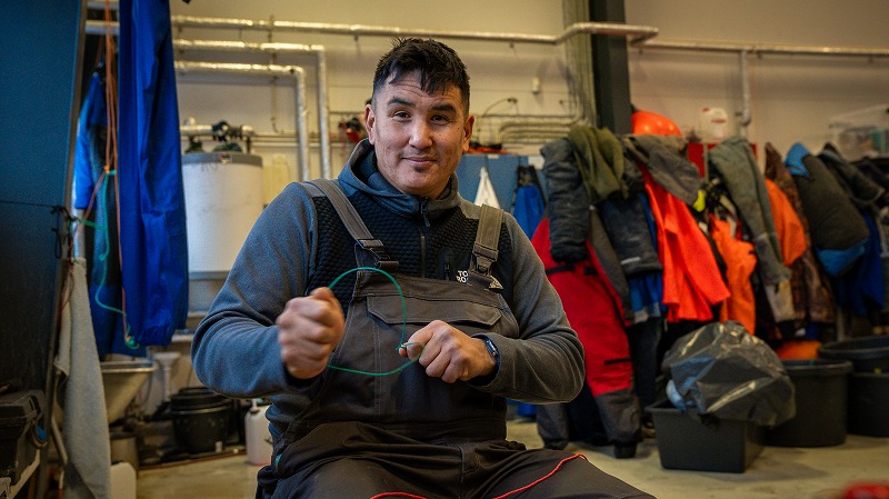 ヌークの港には、グリーンランド経済を支えてきた漁業の現場が広がっている。港のすぐ隣にある倉庫を訪ねると、延縄漁の仕掛けを作る漁師の姿があった。