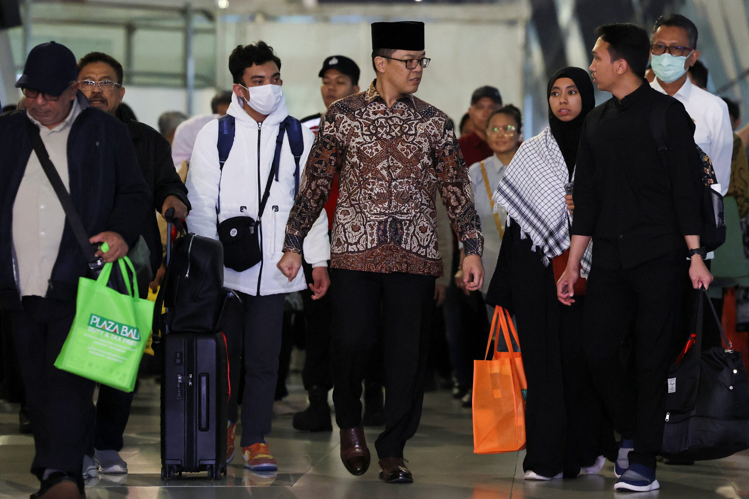 アメリカとイスラエルによるイランへの攻撃を受け、イランから退避したインドネシアの人々をジャカルタ郊外にあるスカルノ・ハッタ国際空港で出迎えたスギオノ外相。(2026年3月10日撮影)(c) ロイター / アフロ