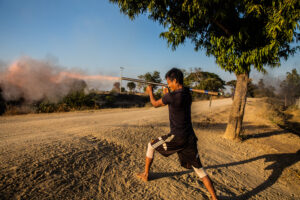 写真③ミャンマー北部ザガイン地域で2022年2月、新たに作った武器をテストするPDFの兵士(マーノウ撮影)