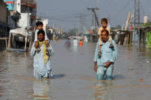 Men carry children on their shoulders and wade along a flooded road, following rains and floods during the monsoon season in Nowshera