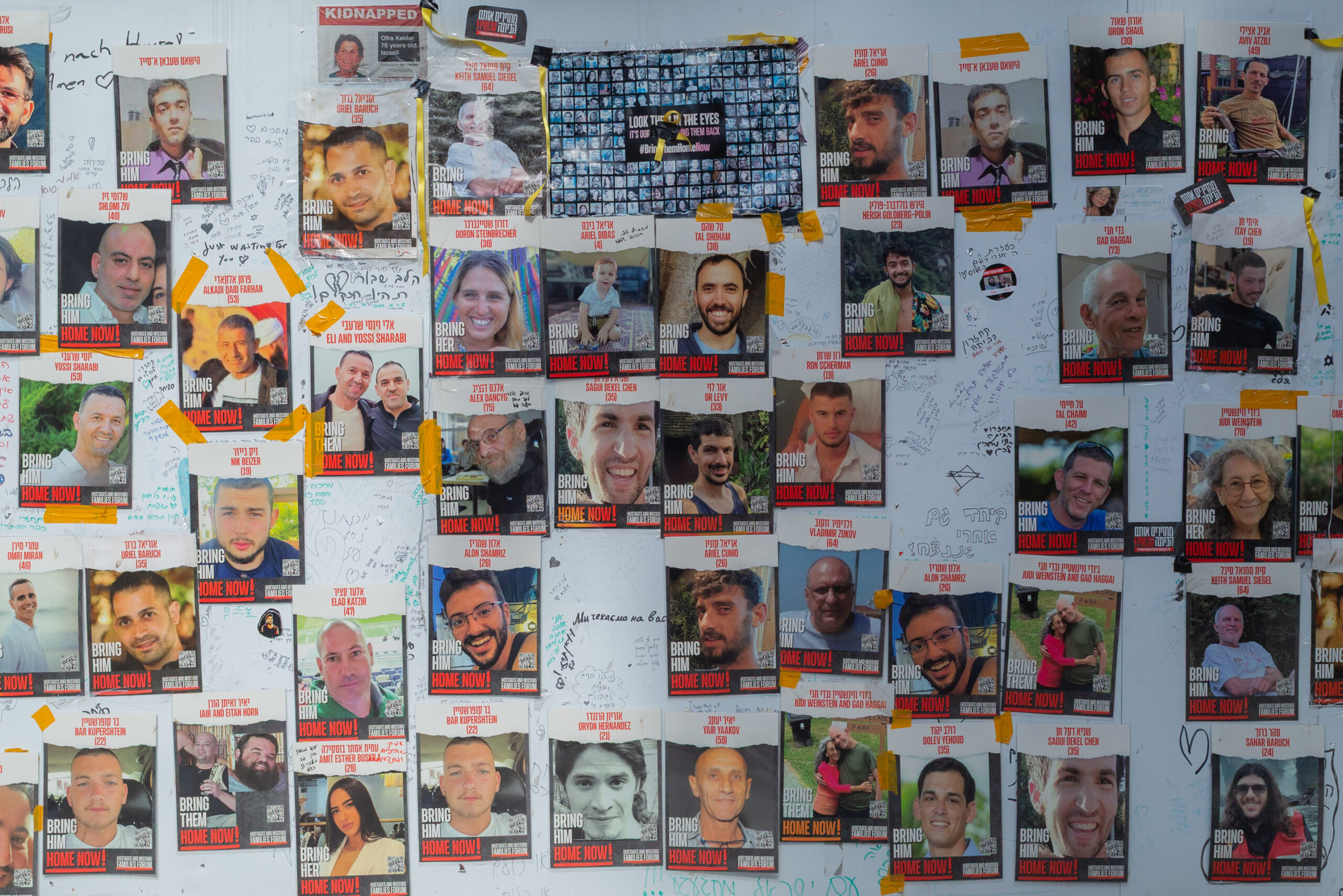 テルアビブ博物館前の壁面に貼られた無数の人質解放を訴えるポスター。 写っているのは、2023年10月7日に発生したハマスによる大規模奇襲攻撃の際に人質となった人々だ =2024年1月、イスラエルのテルアビブで筆者撮影