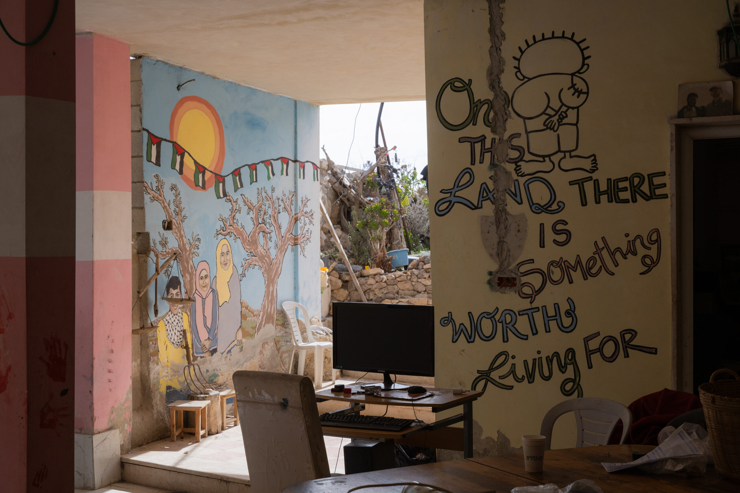 イスラエル人活動家たちが拠点にしている建物。 壁には、パレスチナの絵と共に「この土地には生きる価値のある何かがある」という英文のメッセージが書かれていた =2025年1月、ヨルダン川西岸のマサーフェル・ヤッタで筆者撮影