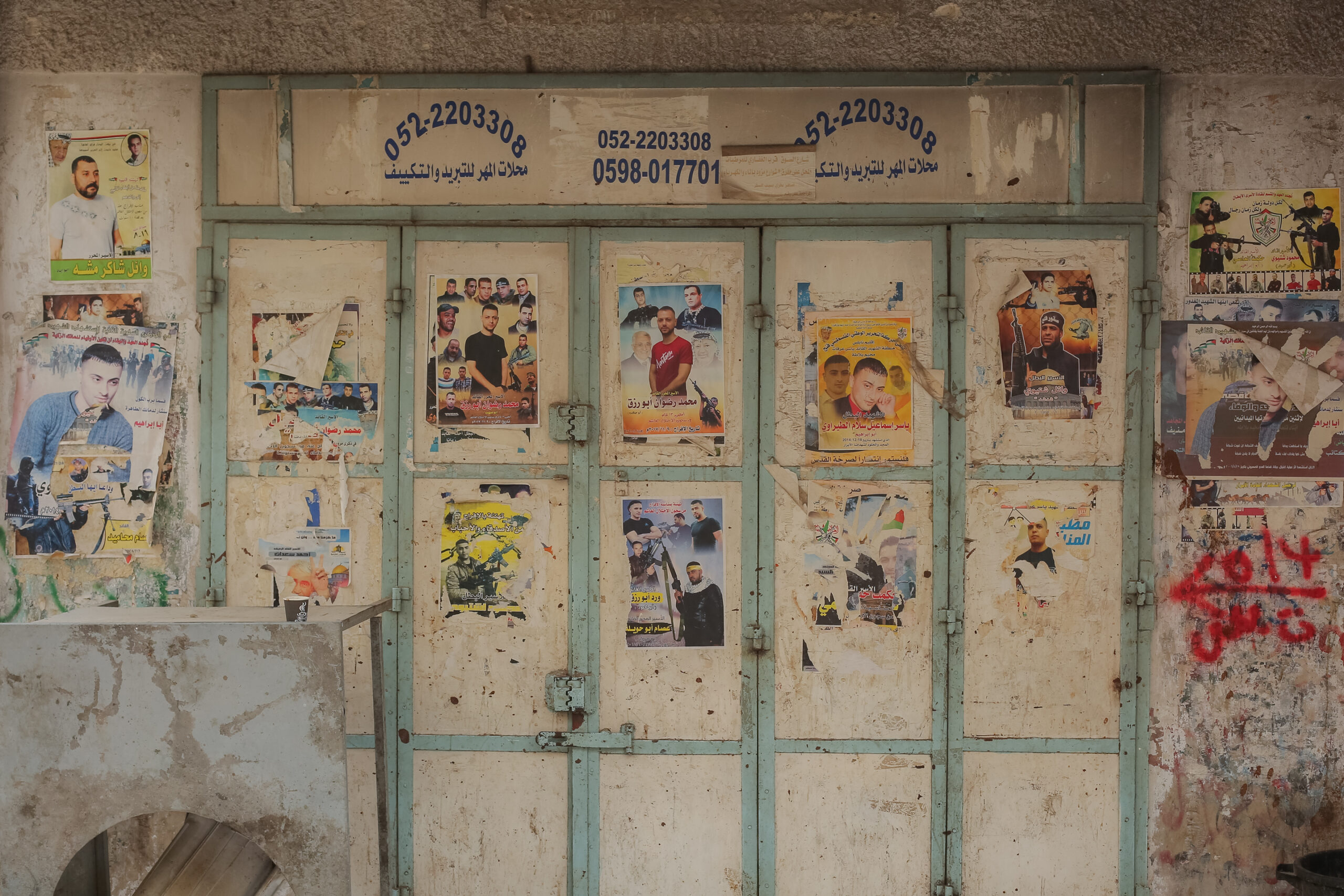 ナブルスのバラータ難民キャンプにある商店の壁には、度重なるイスラエル軍の急襲を受けて亡くなった者たちの在りし日の姿を写した古びたポスターが無数に貼られていた=2018年2月、ヨルダン川西岸ナブルスで筆者撮影