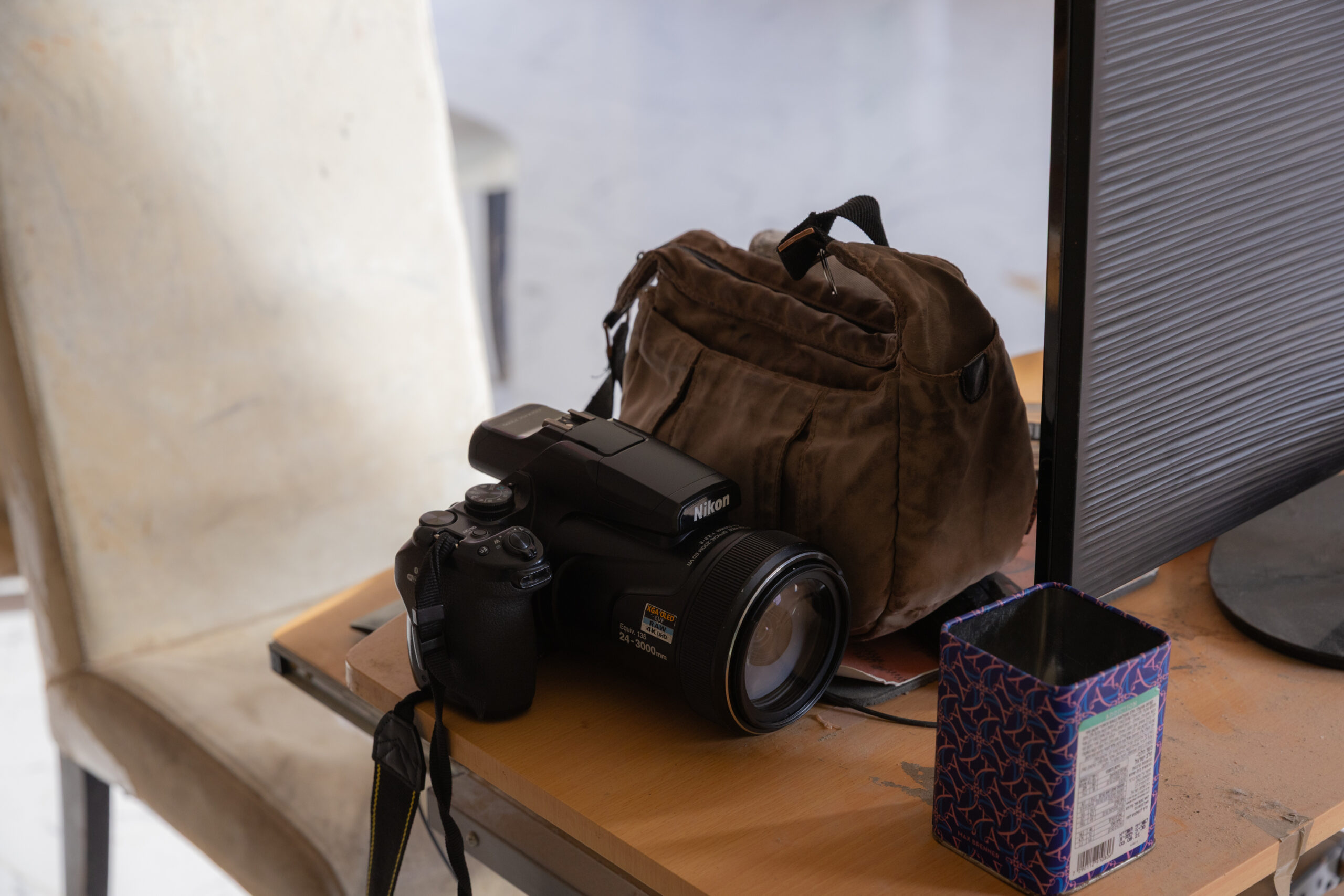 イスラエル人活動家が携帯している超望遠ズームカメラ。 マサーフェル・ヤッタの各所で日夜発生する入植被害の状況を記録するためには欠かせない道具だ =2024年1月、ヨルダン川西岸のマサーフェル・ヤッタで筆者撮影