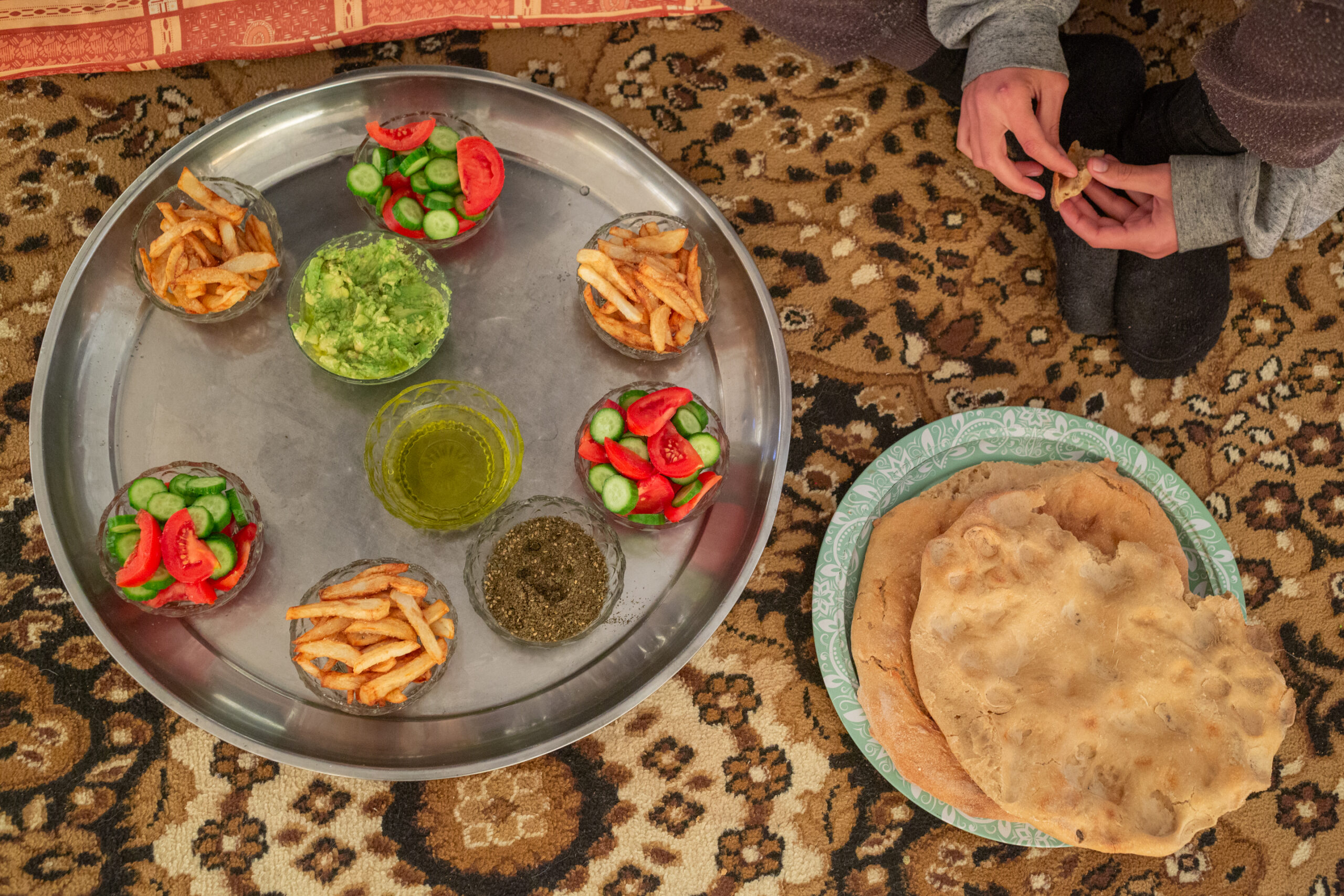 ホームステイしていたパレスチナ人宅で出された朝食。 サラダやフライドポテトを付け合わせにアラブのピタパンにオリーブオイルやザータル(ハーブの一種)を付けて食す定番の食事だ=2024年1月、ヨルダン川西岸のマサーフェル・ヤッタで筆者撮影