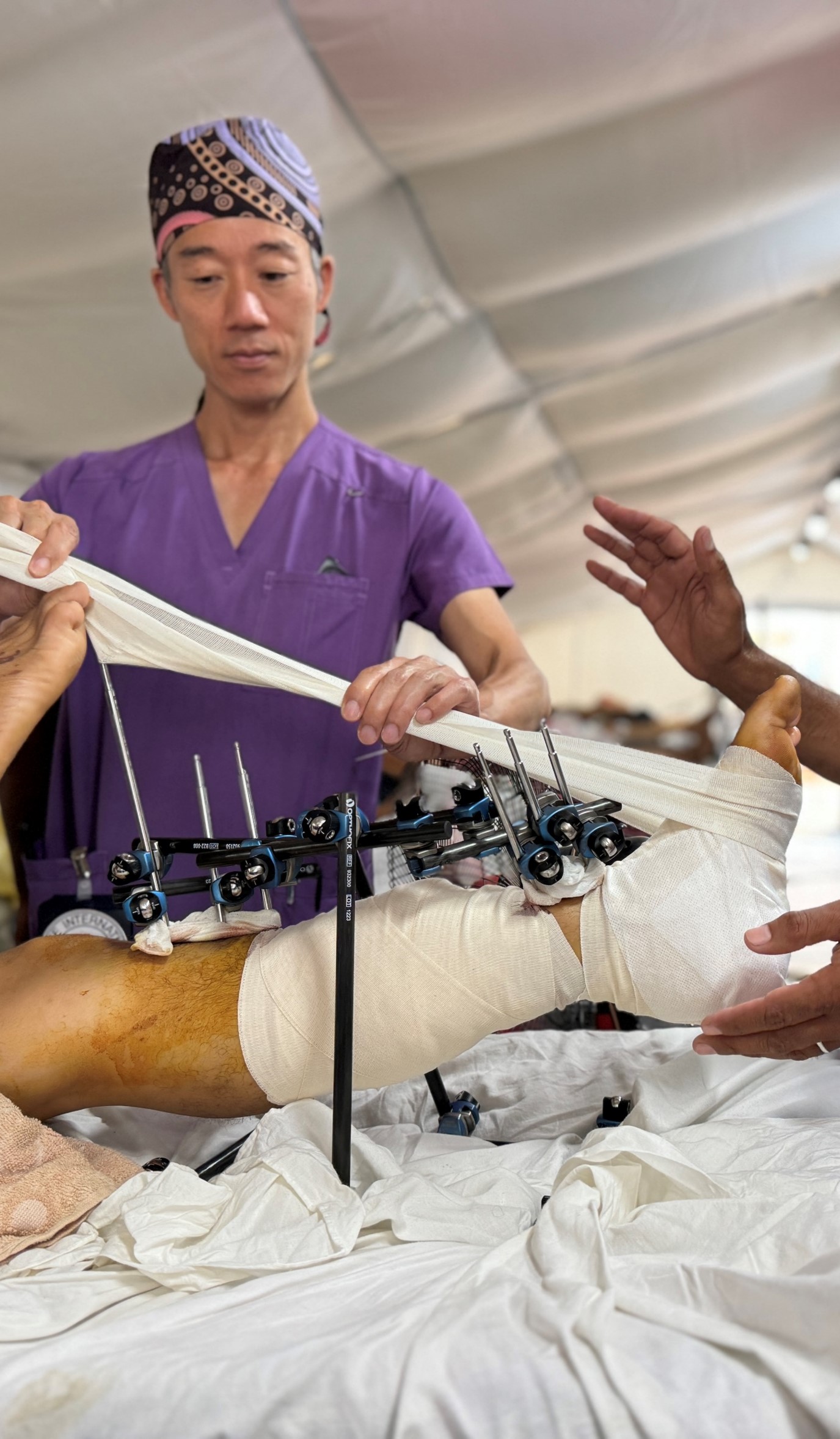 安藤医師 衛生環境が悪い現地では、日本のような理想的な治療はできません。特に難しいのが、骨や関節を扱う整形外科治療です。無理に高度な治療をすれば感染リスクが高まるため、その環境下で可能な治療を行い、環境が改善した段階で修復・再建する、という考え方で進めています。また、抗菌薬も不足しており、菌の種類に応じた使い分けが難しいため、限られた選択肢の中で「可能性が高い菌」に絞って対応しています。サイズの合う手袋もなくなり、残っている産婦人科用の長い手袋を使う場面もありました。
