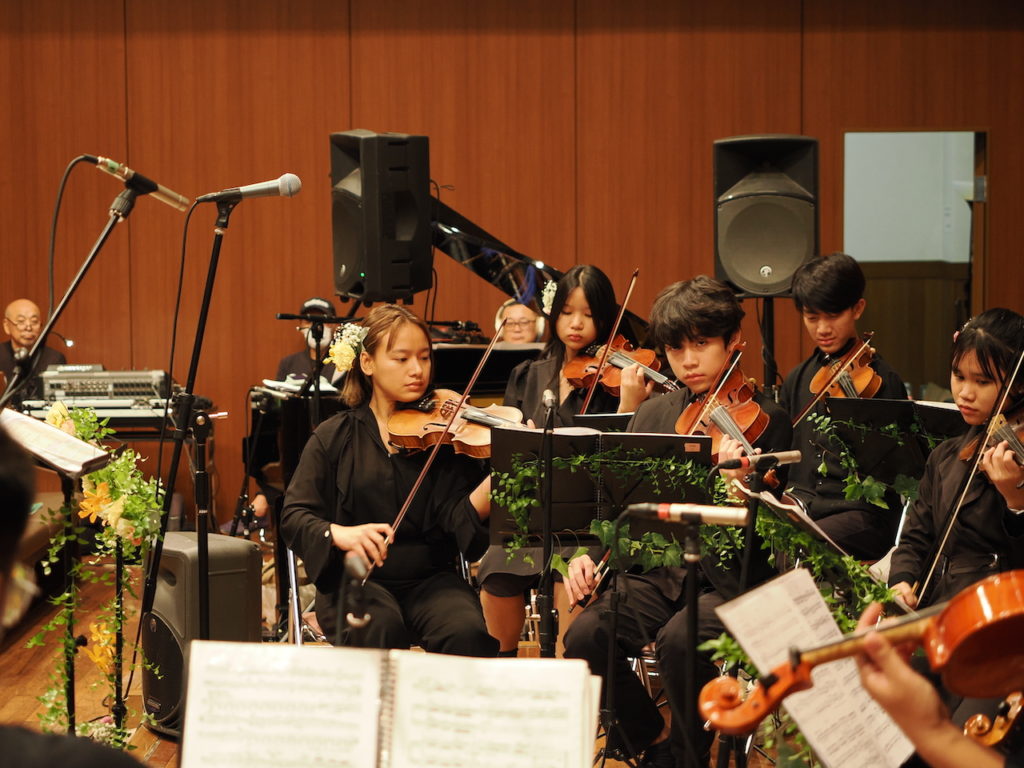 グリーグの組曲『ホルベアの時代から』に始まり、ヴィヴァルディ『四季』の「春」第1楽章では、前出のプロ志望のカオタンさんがバイオリンのソロで鳥の歌を奏でた。さらにタイの歌曲や『あんたがたどこさ』『ふるさと』など日本歌曲のメドレー、『リベルタンゴ』などが演奏されるにつれて、オーケストラの熱気が会場を覆っていく。満席の聴衆が静かに思いを高揚させ、微細な音の一つ一つも聴き漏らすまいと、食い入るように耳を傾けているのがわかる。
