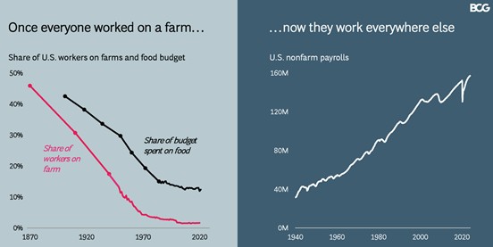 上図は、アメリカのコンサルティング大手のボストン・コンサルティング・グループが農業・非農業部門の従事者数の推移をまとめたものである。19世紀中盤までは、アメリカの人口の大多数が農業に従事していたが、左図は産業革命や工業化によって農業従事者が急減したことを示しており、右図はことを示している。